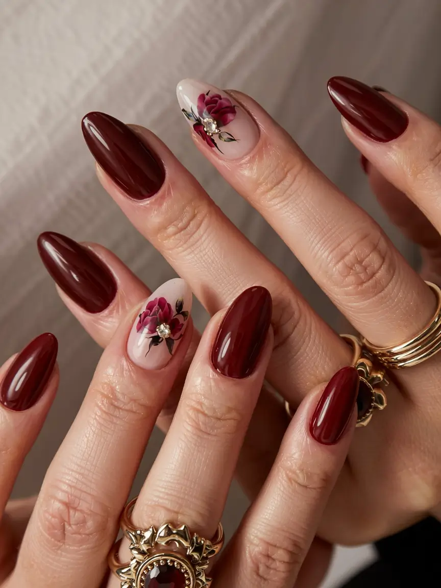 And the air is brisk, and the coats are forthcoming, and low and smooth notes are alluring. Something magnetic about burgundy winter nails colors 2025 2026 is that it is bold and timeless, passionate but calm. The color does not merely speak of a sense of sophistication; this season tells a tale of silent confidence. Have you ever realized that there are shades that make you feel complete? That Burgundy does – easily. We will take a look at the colors and patterns that characterize the mood of this winter in each of the manicures. Velvet Wine with Floral Accent…