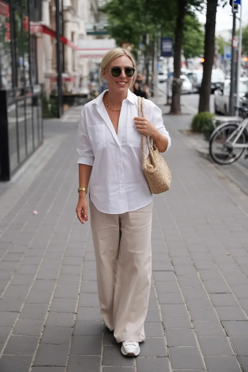 And yes, I have done this myself with vintage pieces and thrifted men’s shirts and it still worked. This look is timeless and has great versatility. Worn in your fifties or twenties, this combo is incredibly flattering while feeling effortless. Pillar look in **simpl summer legging outfits ideas 2025**.